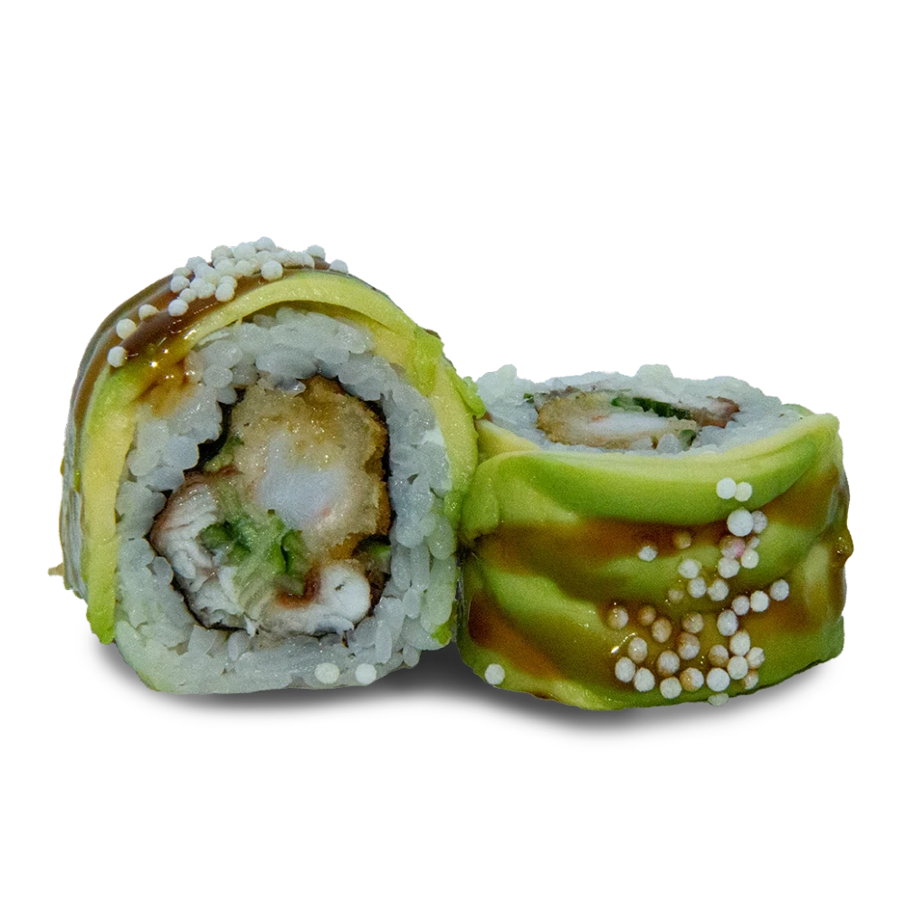 Orez, nori, creveți crocanți furai, anghilă prăjită, avocado, castraveți, sos unagi, icre masago, perle de orez.